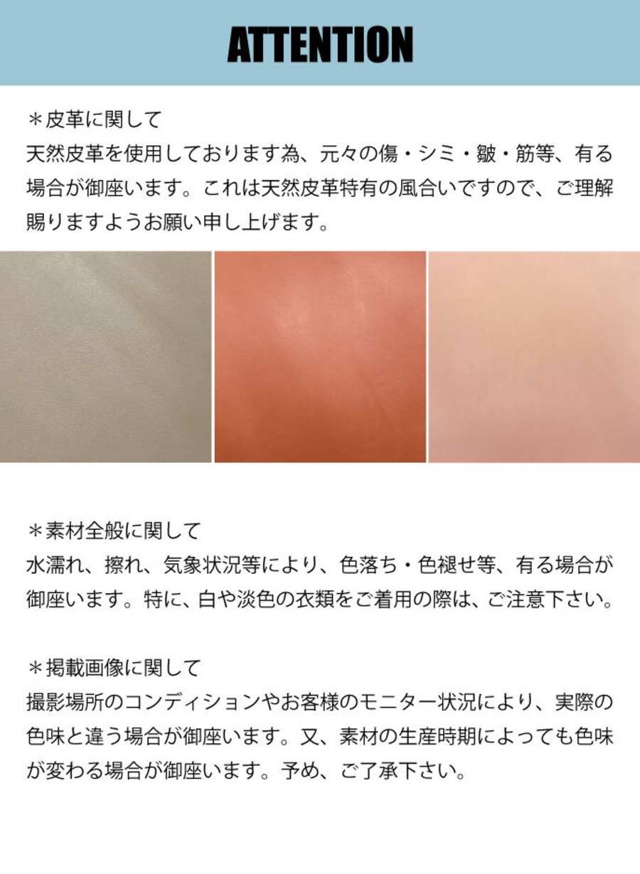 天然皮革を使用しておりますため、元々の傷・シミ・皺・筋等が見受けられる場合がございます。これは天然皮革特有の風合いですので、ご理解いただけますようお願い申し上げます。
